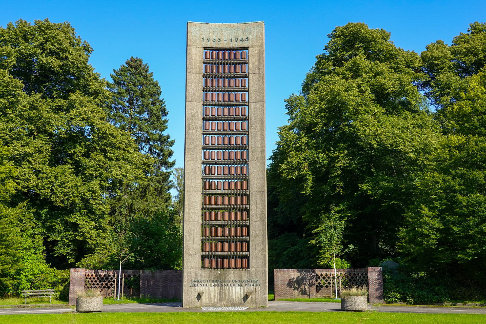 To get to the memorial site, we start at the main entrance, turn left, and walk straight ahead along Talstraße. We pass the Fritz-Schuhmacherhalle (on the left) and see the massive memorial to the victims of Nazi persecution on the right.