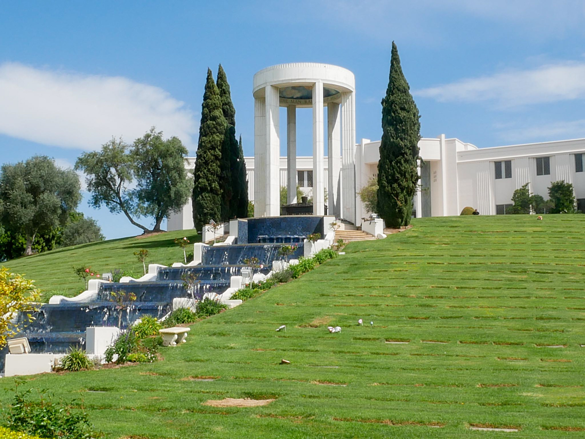 Hillside Memorial Park is the final resting place for many prominent figures, including famous actors such as Leonard Nimoy, Michael Langdon, Lorne Greene, and entertainer Al Jolson, who is very present with his imposing monument. The cemetery is a strictly Jewish cemetery, known for its tradition, and offers special areas for Jewish burials.