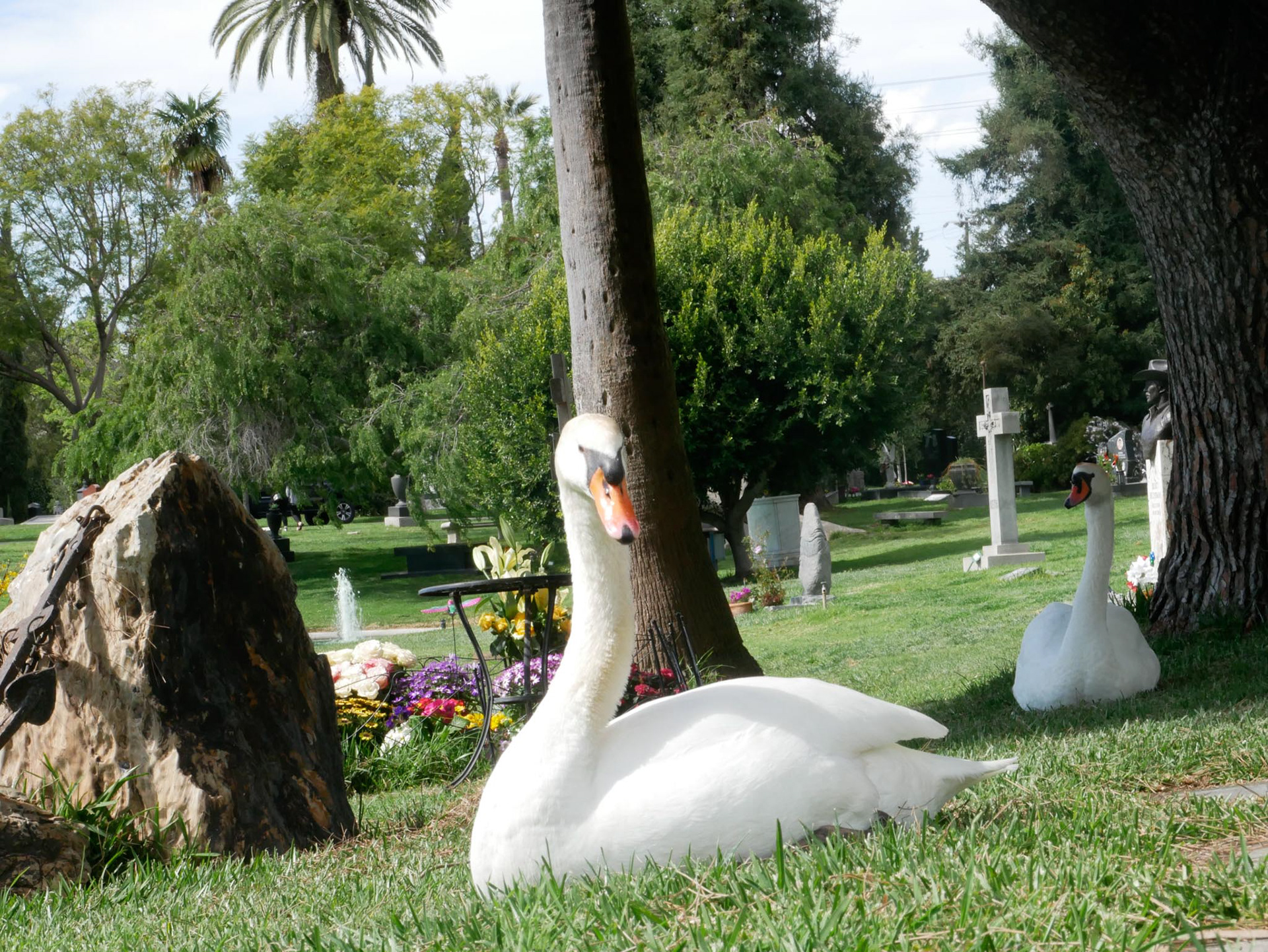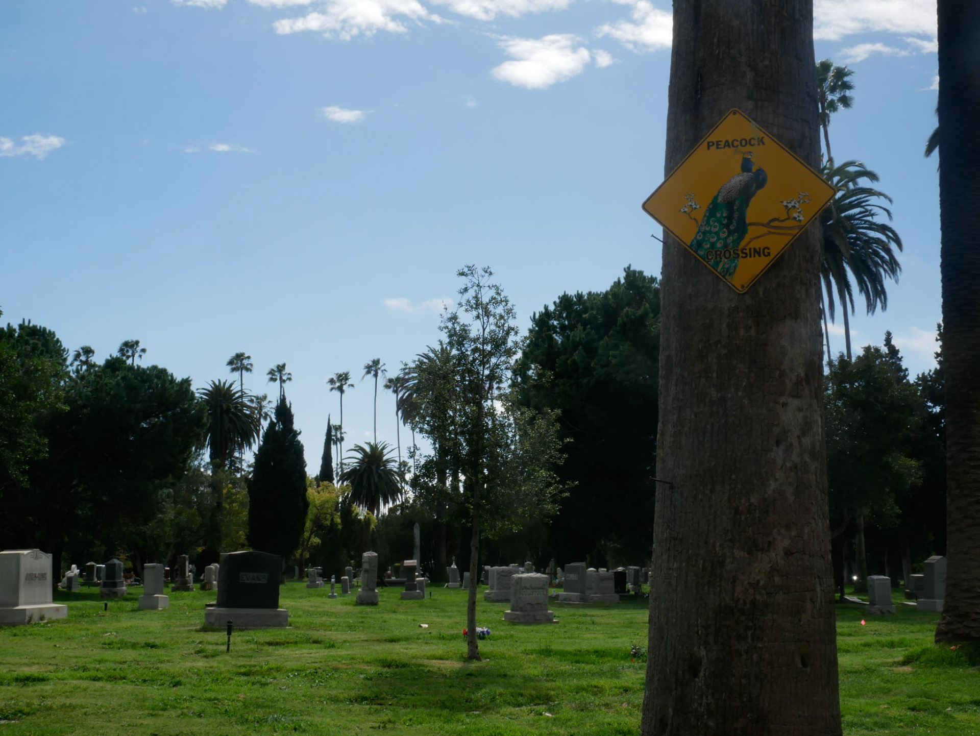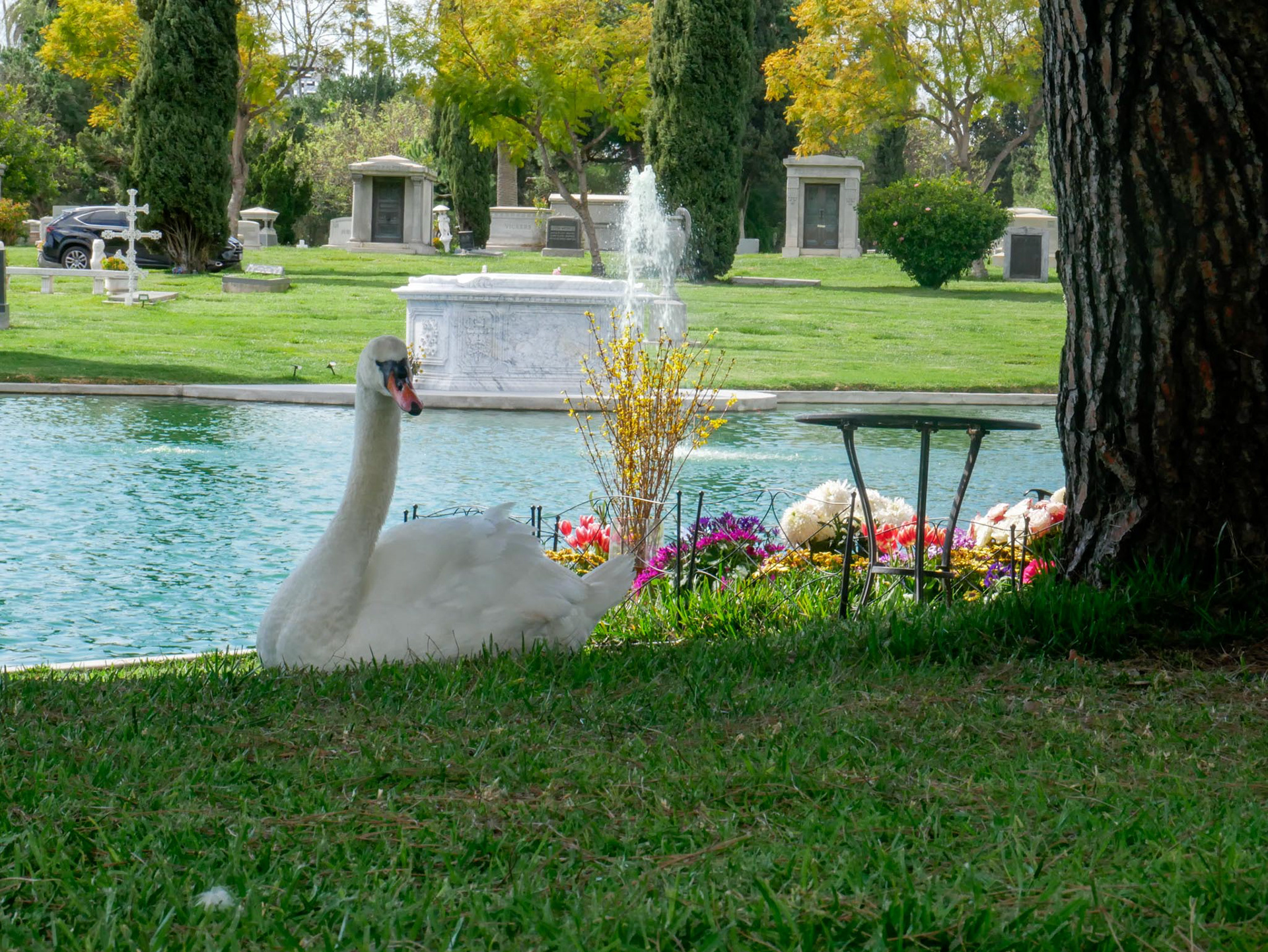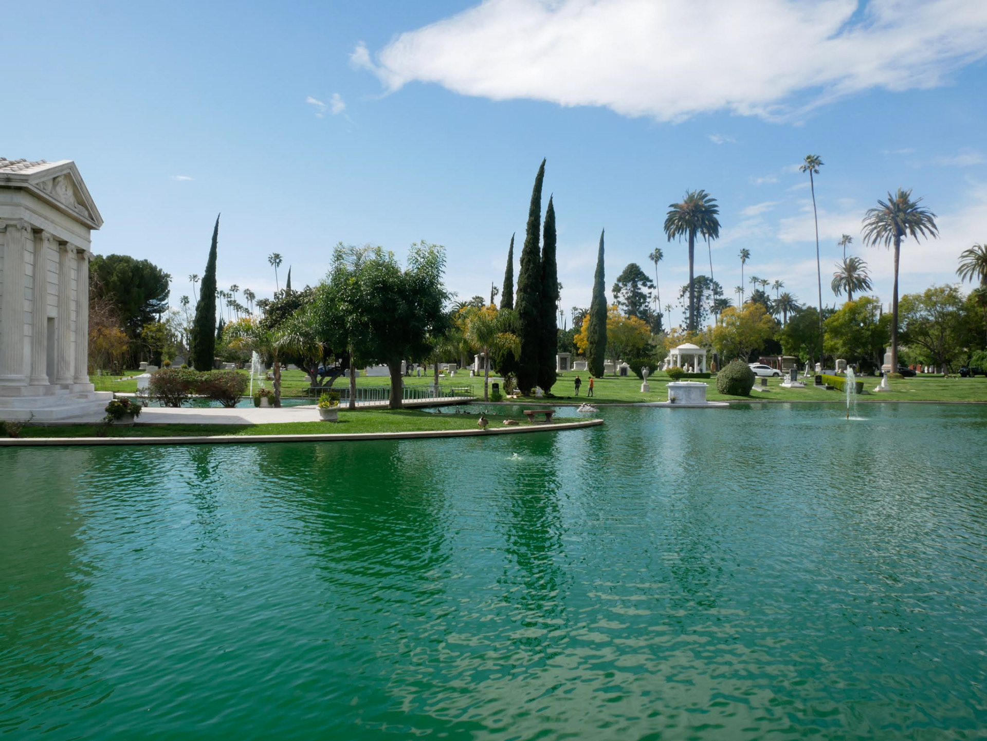 When you enter a cemetery in Hollywood, you have certain expectations, which, in my opinion, are fully met. Within sight of the “Hollywood” sign, you are greeted at the entrance by a Rolls Royce hearse. Pompous tombs, lakes, fountains, all perfectly suited to this location. Peacocks, swans, geese, squirrels, and much more make a visit here a real experience.