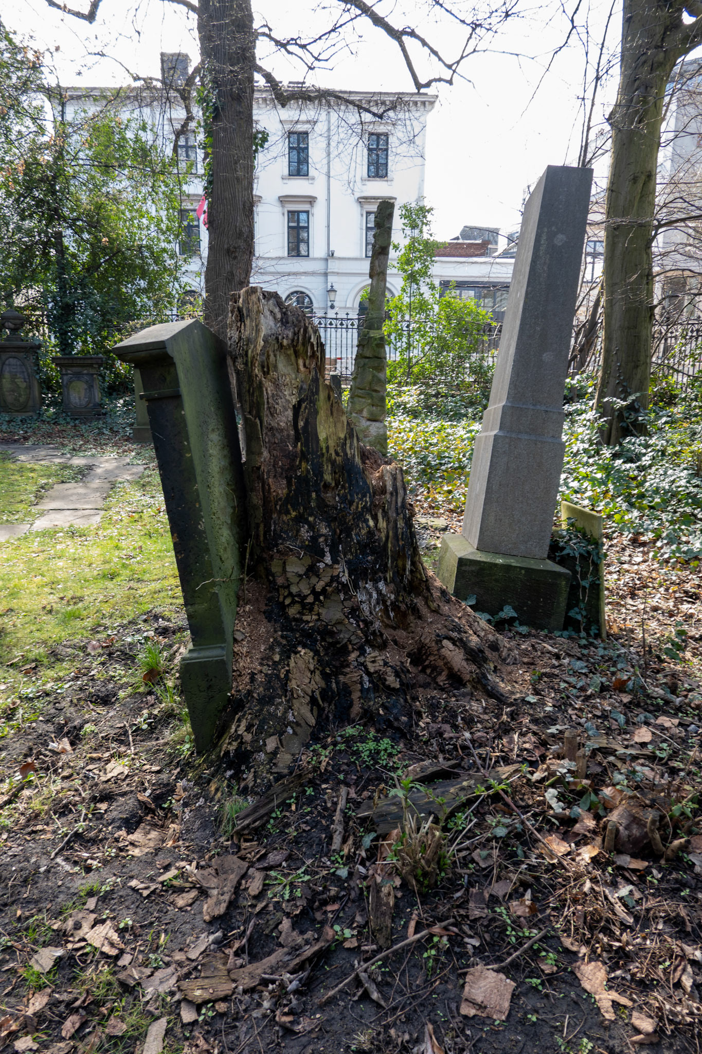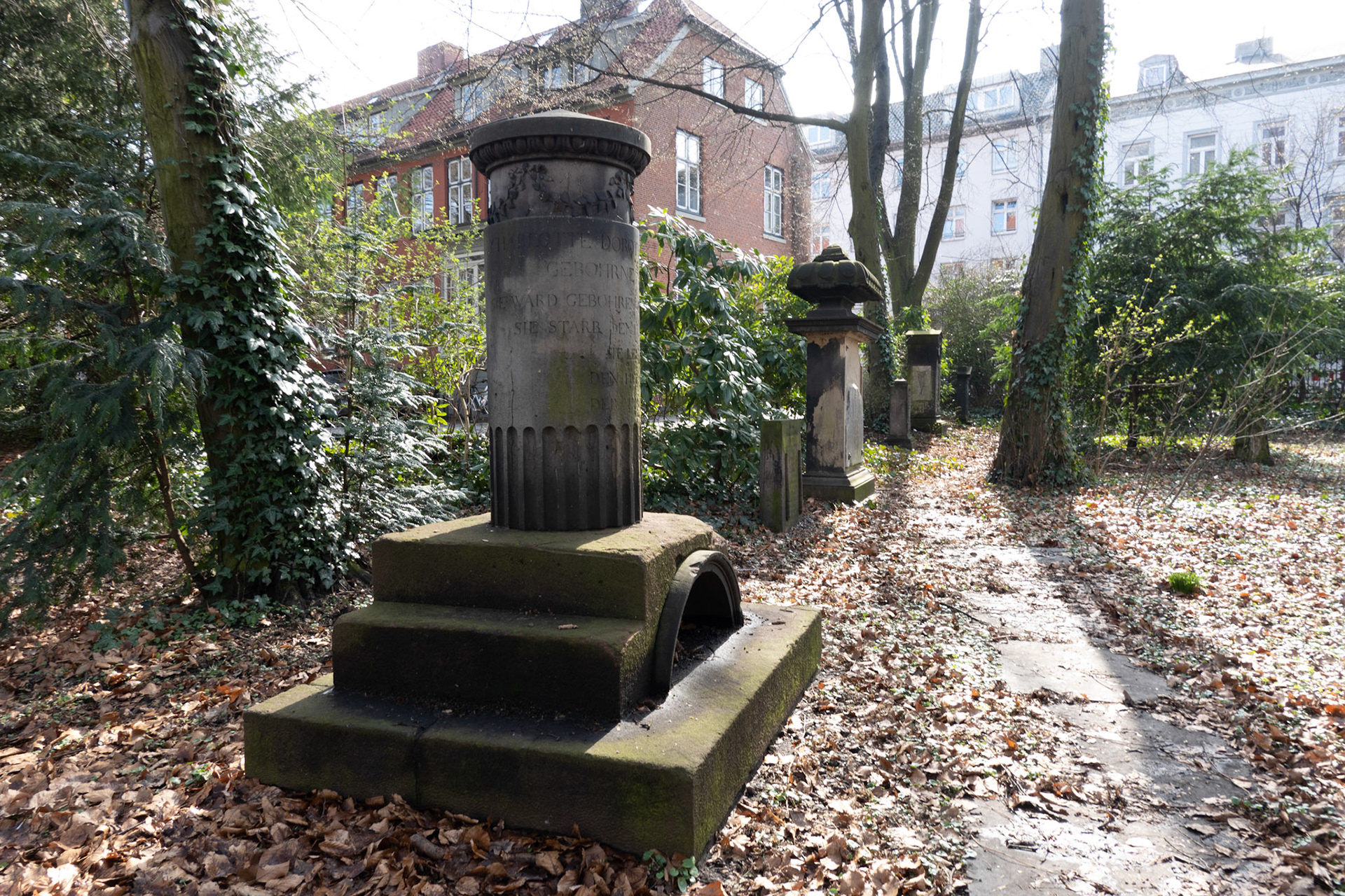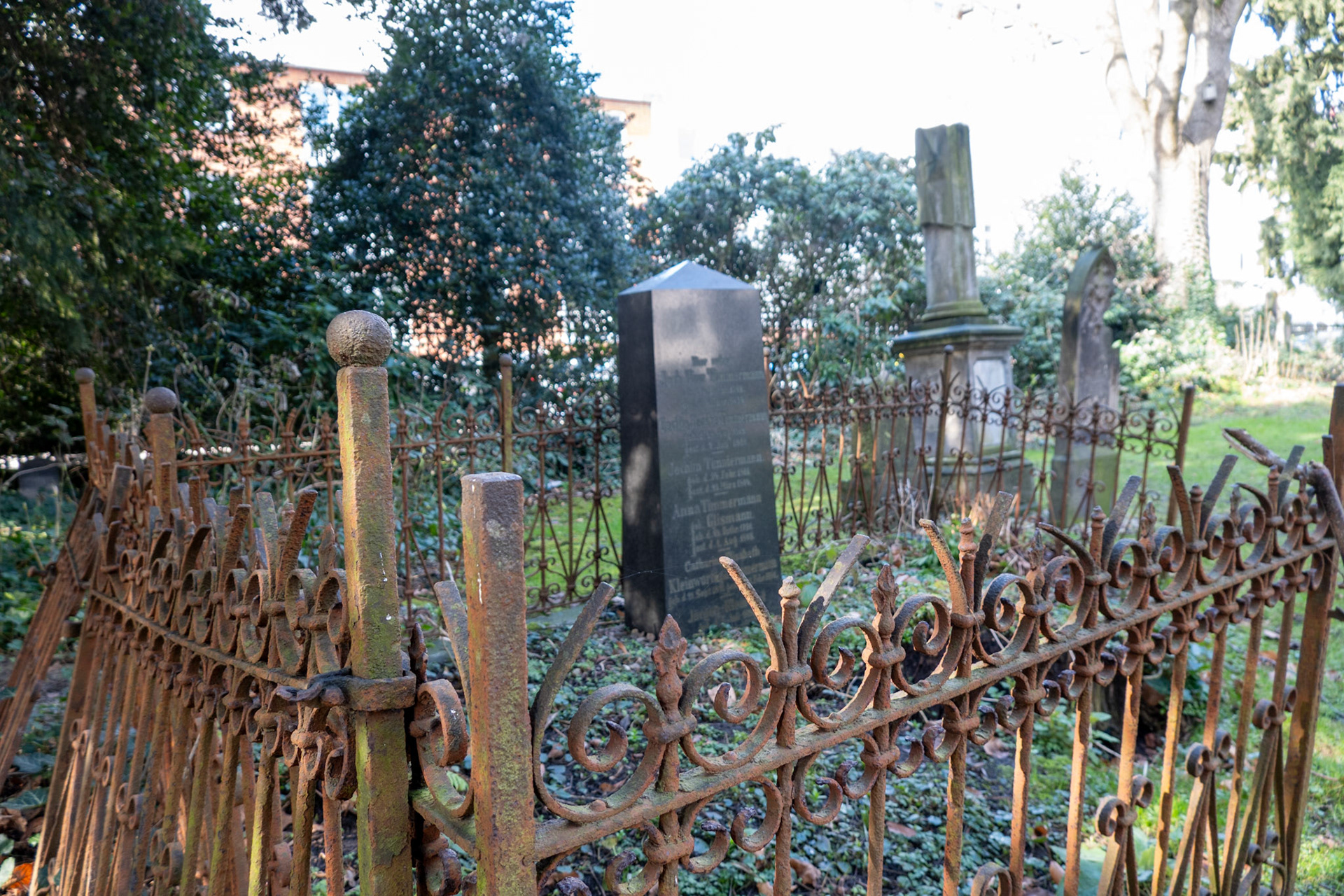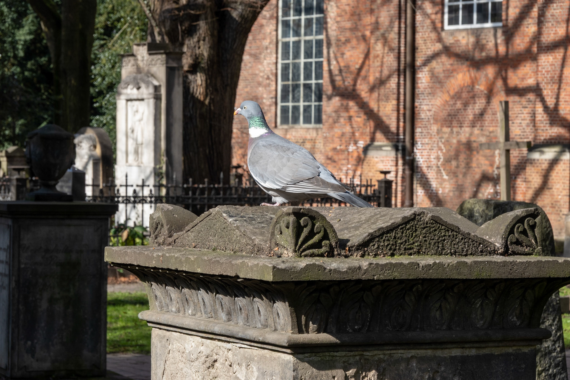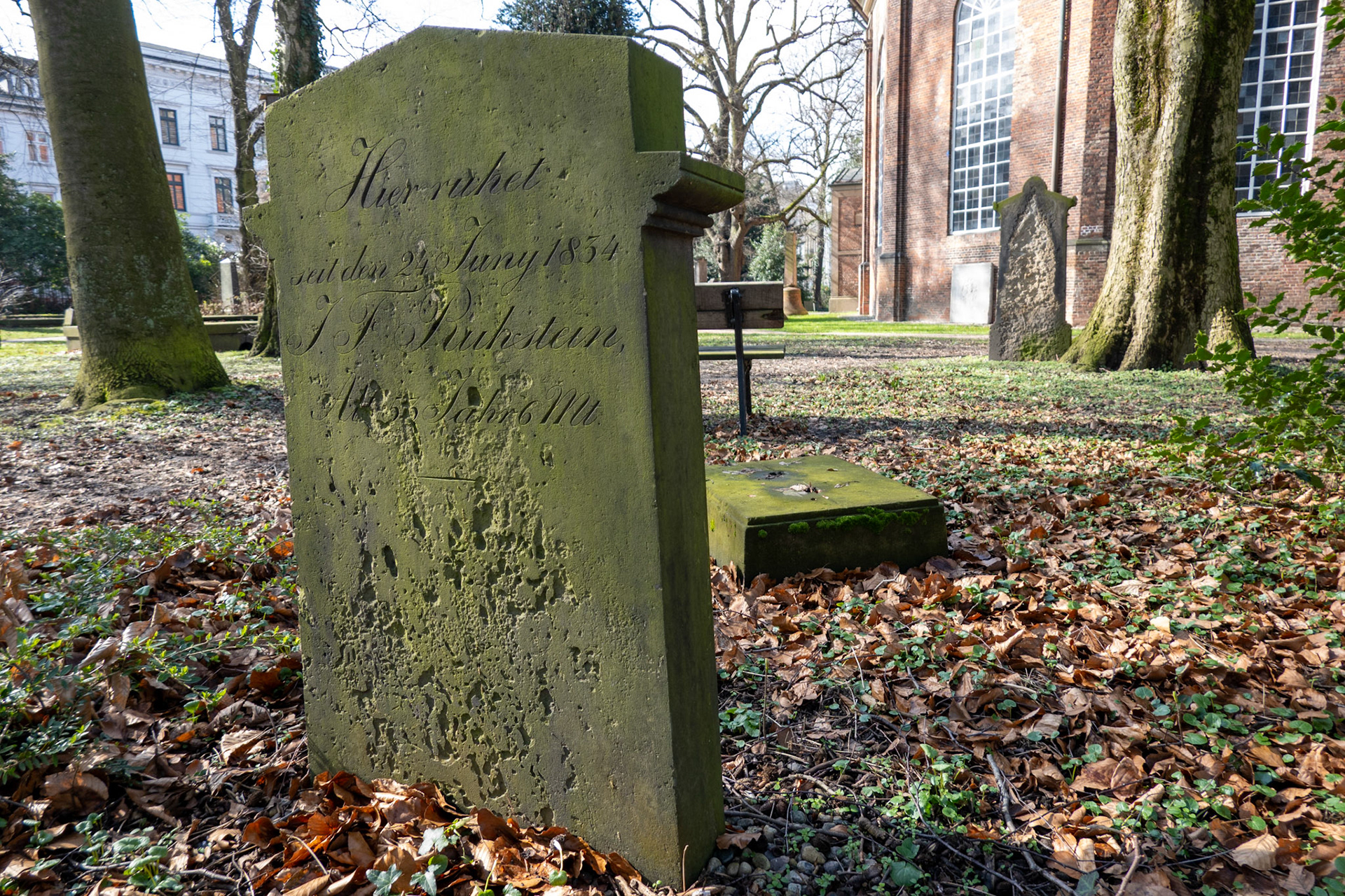 The church has a cemetery that was likely used for burials as early as 1537; the last burial took place in 1929. The graves are scattered across the grounds, some hidden in bushes, and the epitaphs are often no longer legible.